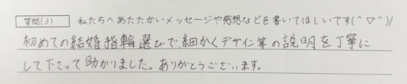 初めての結婚指輪選びで、細かくデザイン等の説明を丁寧にして下さって助かりました。ありがとうございます。